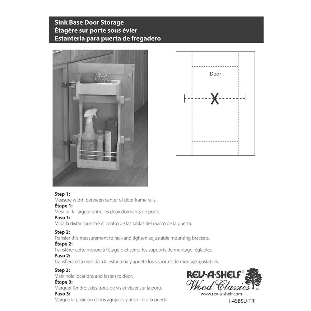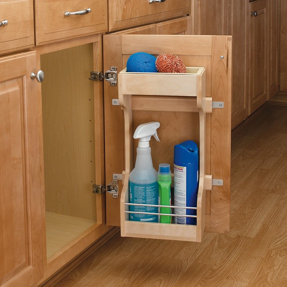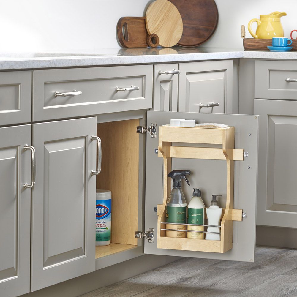 This Rev-A-Shelf Door Mount Cleaning Supply Rack features a polymer tray on the top shelf that can be removed for easy cleaning.